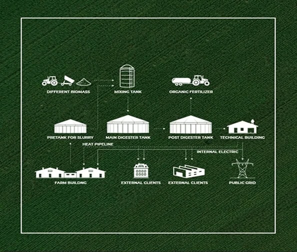 Біогазовий завод потужністю 1,1 МВт переробляє органічні відходи та гній зі свиноферм за допомогою анаеробного зброджування. Біогаз, що утворюється в процесі, спалюється для отримання електроенергії та тепла, що дозволяє зменшити викиди парникових газів і мінімізувати вплив на довкілля. Після виробництва біогазу залишки біомаси використовуються як добриво, відповідаючи всім сільськогосподарським нормам і найкращим практикам. Воно краще засвоюється рослинами та практично не має запаху, що забезпечує чистіше та здоровіше середовище.
